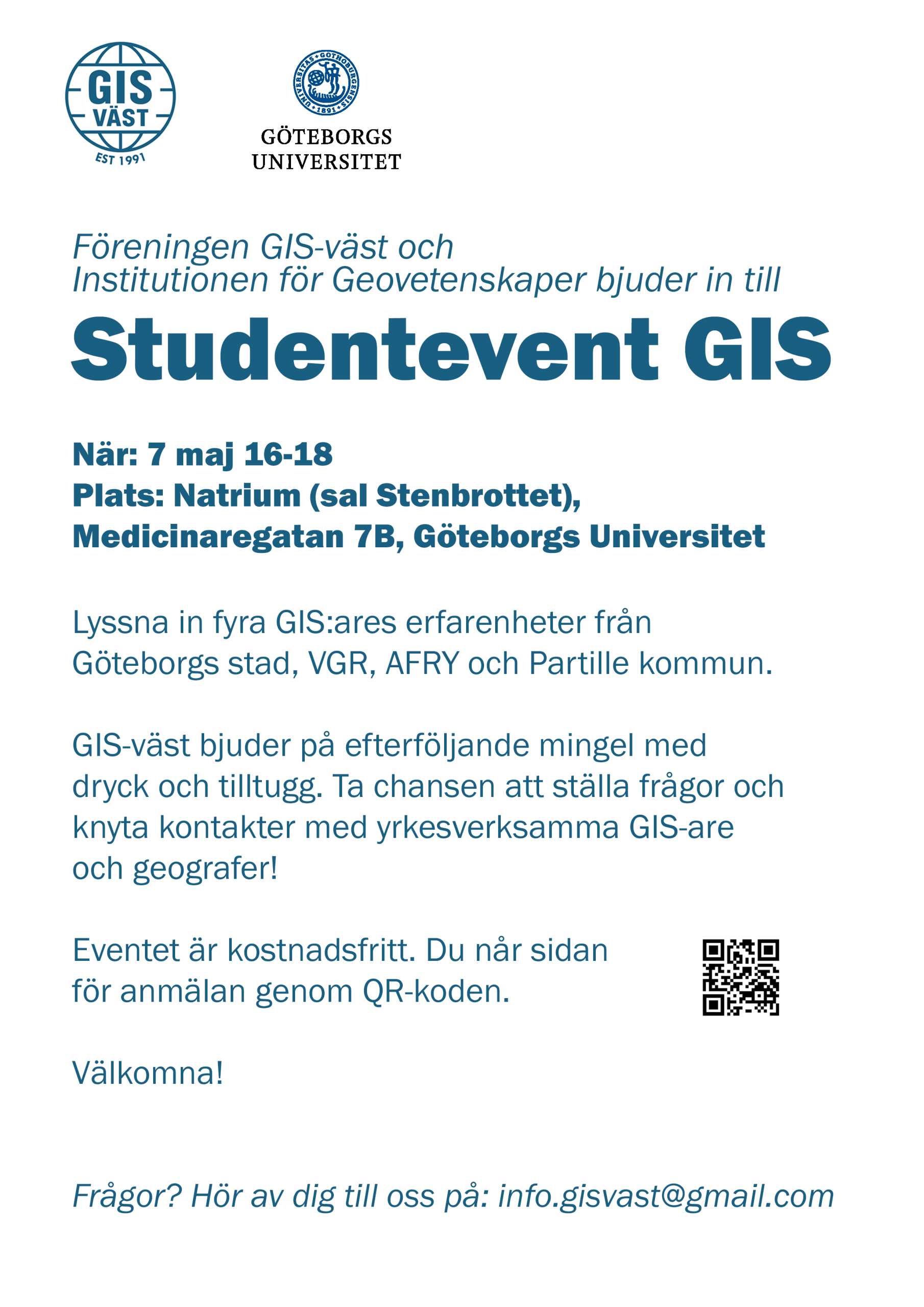 Välkomna till GIS-väst årsmöte! Fredagen den 20 mars kommer GIS-väst att ha sitt årsmöte på Sweco Göteborg, Skånegatan 3. Det går även att delta över TEAMS. Vi inleder med lunch, som föreningen bjuder på, och träffas i receptionen på Sweco, kl. 11:45. Detta åtföljs av årsmöte mellan ca kl. 13:00 och 14:00. Anmälan och inskickande